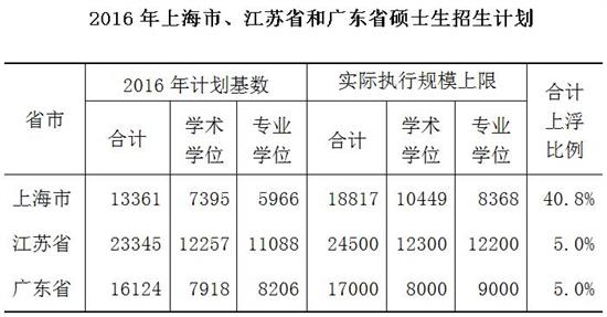 附件:2016年上海市、江苏省和广东省硕士生招生计划